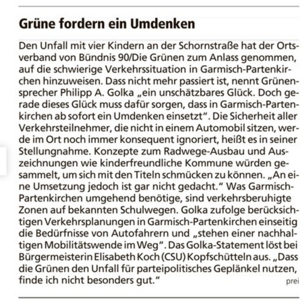 Es bleibt einem kurz die Luft weg, wenn man die Berichterstattung zum Unfall an der Ecke Schornstr./ Fritz-Müller-Str. liest. Ein unschätzbares Glück, dass dort nicht mehr passiert ist. Doch gerade dieses Glück muss dafür sorgen, dass in Garmisch-Partenkirchen ab sofort ein Umdenken einsetzt.