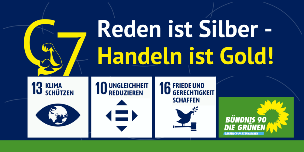 Aus diesem Grund wird der Grüne OV auch die anstehende Aufnahme der BR Sendung „Jetzt red i“ am 22.06. in der Garmisch-Partenkirchener Bayernhalle nutzen, um auf die Notwendigkeit solcher Beschlüsse hinzuweisen: „Reden ist Silber, Handeln ist Gold“ so Philipp Golka, Sprecher des Grünen OV Garmisch-Partenkirchen. „Insbesondere auf die von den Vereinten Nationen entwickelten Ziele für eine nachhaltige Entwicklung zum Schutz unseres Planeten möchten wir hinweisen. Aber auch wegen der in weiten Teilen der Welt drohenden Hungerskatastrophe, appellieren wir an alle Teilnehmer des G7-Gipfels, gemeinsam Verantwortung zu übernehmen!“