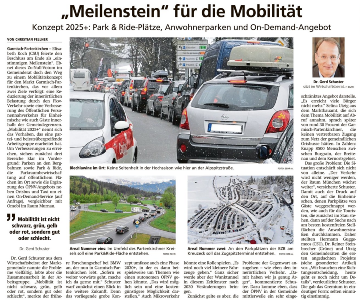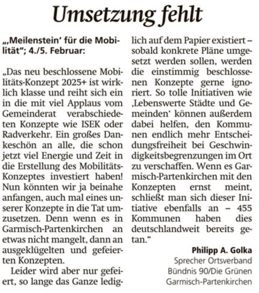 „Das neu beschlossene Mobilitäts-Konzept 2025+ ist wirklich klasse und reiht sich ein in die mit viel Applaus vom Gemeinderat verabschiedeten Konzepte wie ISEK oder Radverkehr. Ein großes Dankeschön an alle, die schon jetzt viel Energie und Zeit in die Erstellung des Mobilitäts-Konzeptes investiert haben! Nun könnten wir ja beinahe anfangen, auch mal eines unserer Konzepte in die Tat umzusetzen. Denn wenn es in Garmisch-Partenkirchen an etwas nicht mangelt, dann an ausgeklügelten und gefeierten Konzepten.