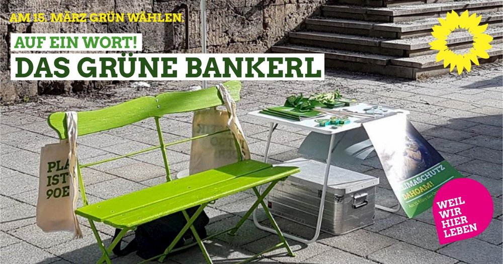 Wir laden Euch ein zum Gespräch auf unser Grünes Bankerl. Schaut vorbei, setzt euch zu uns und lernt die Grünen Kandidat*innen kennen!