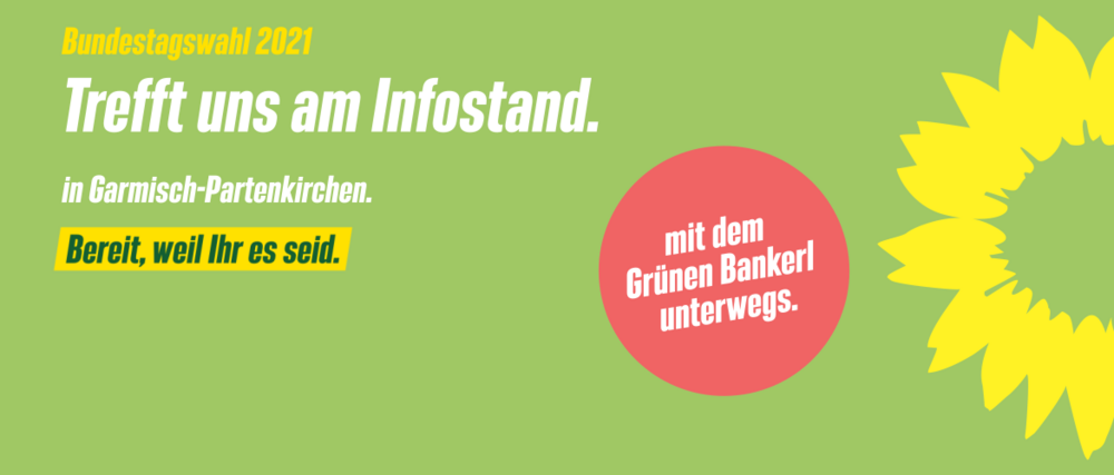 Ab Ende August stehen wir für euch immer mal wieder abwechselnd in Partenkirchen (Kirchplatz/Ludwigstraße) und in Garmisch (Bischoffeck/Fußgängerzone) am Grünen Infostand. Wieder mit dabei: Unser Grünes Bankerl "Auf ein Wort".