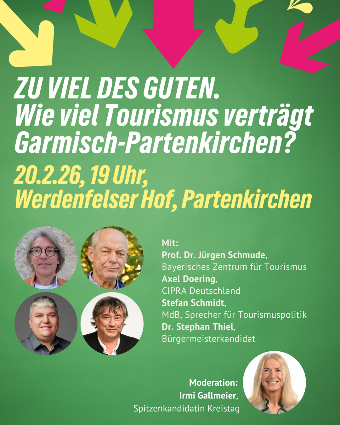 Vom Kreisverband der Grünen Garmisch-Partenkirchen greifen wir ein zentrales Thema im Landkreis auf, das auf viele Probleme - von Mobilität und bezahlbarem Wohnraum bis hin zu Lebensqualität für Einheimische und vor allem den Erhalt unserer schönen Natur einzahlt: den Tourismus. Wir stellen die Frage: